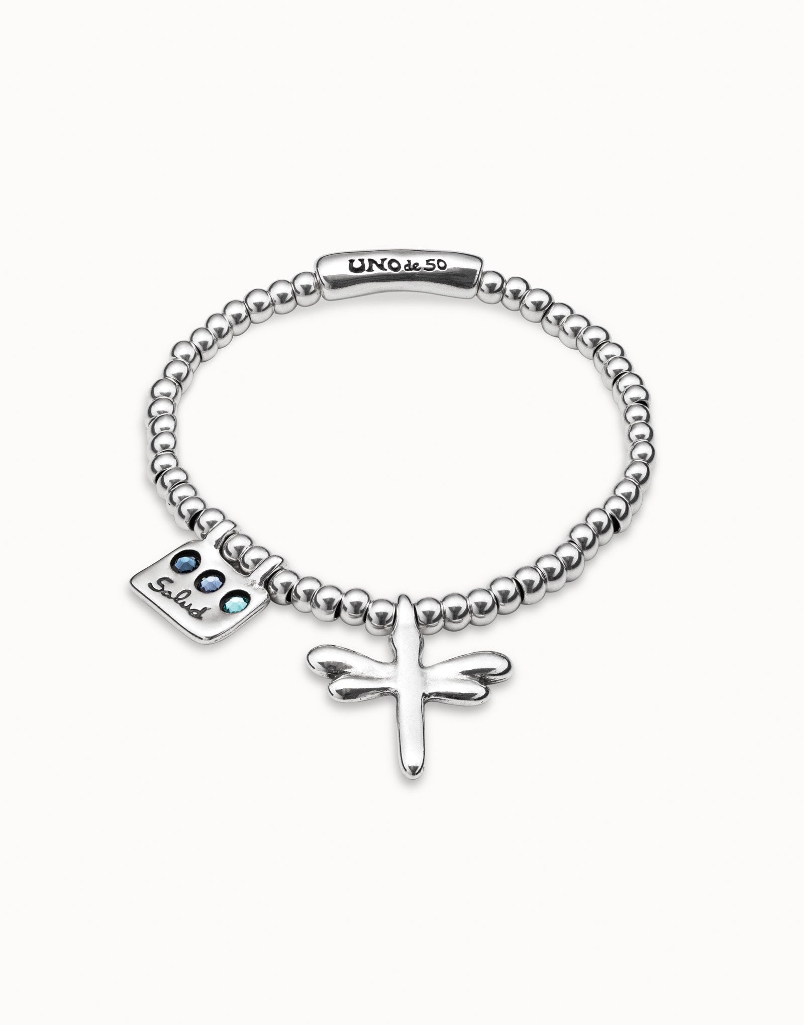Elastic bracelet with multiple circular sterling silver-plated metal beads and two charms, one in the shape of a dragonfly and the other with the message “health” and three blue Swarovski...