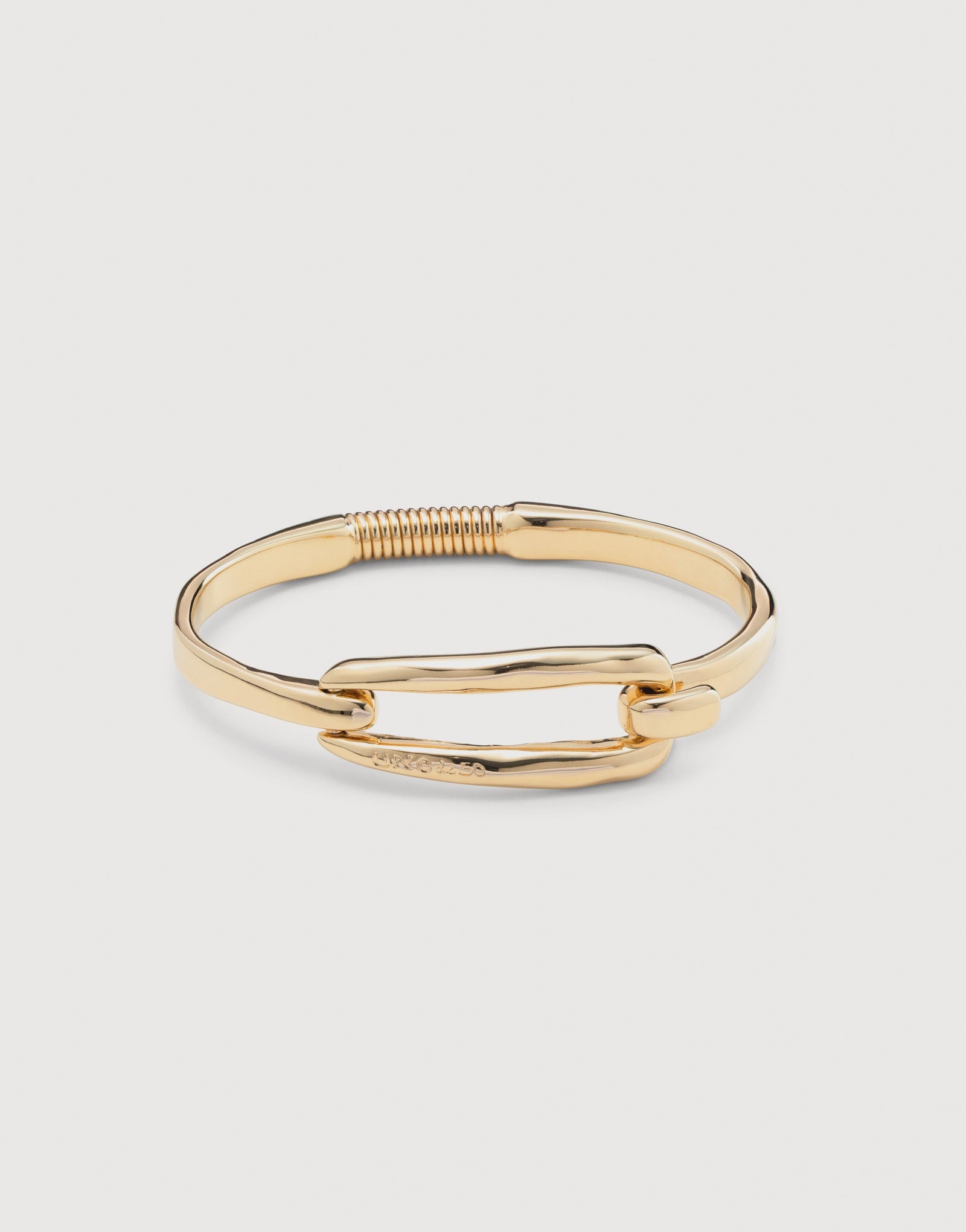 Rigid gold plated bracelet with an original rectangular buckle clasp in the middle and UNOde50 brand name engraved. A bracelet created by UNOde50 and in Spain 100% by hand.