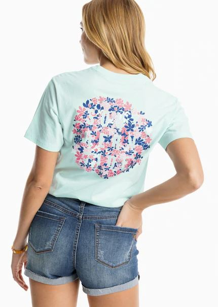 Celebrate beach life with a comfortable t-shirt in striking colors. A small orange Southern Tide Skipjack adorns the front chest, while a back graphic frames sunset colors between palm tree...