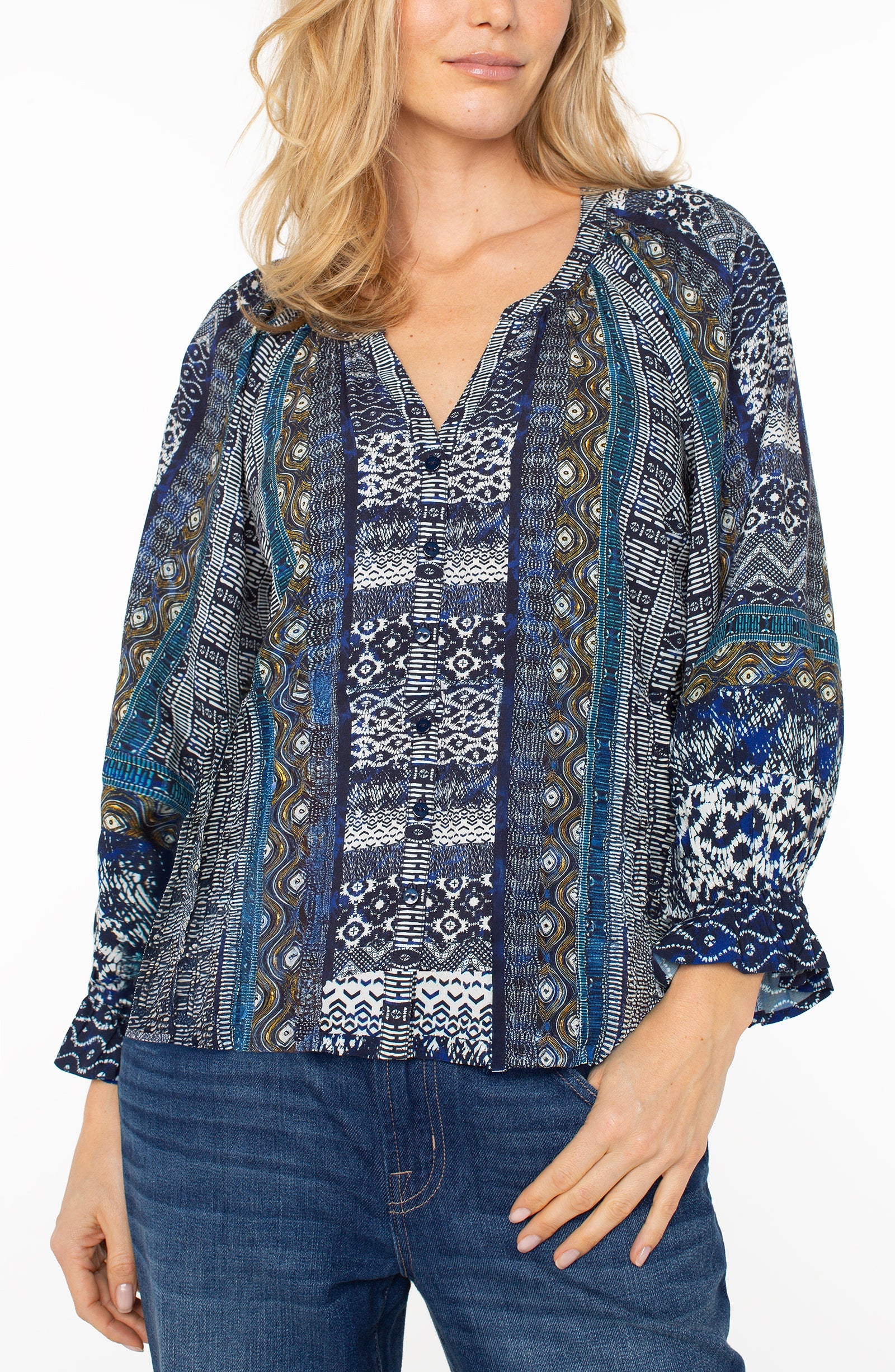 This airy blouse features a painterly blue shibori pattern, softened by shirring at the neckline and a relaxed raglan sleeve. Ruffled cuffs and a button-front closure add a hint of...